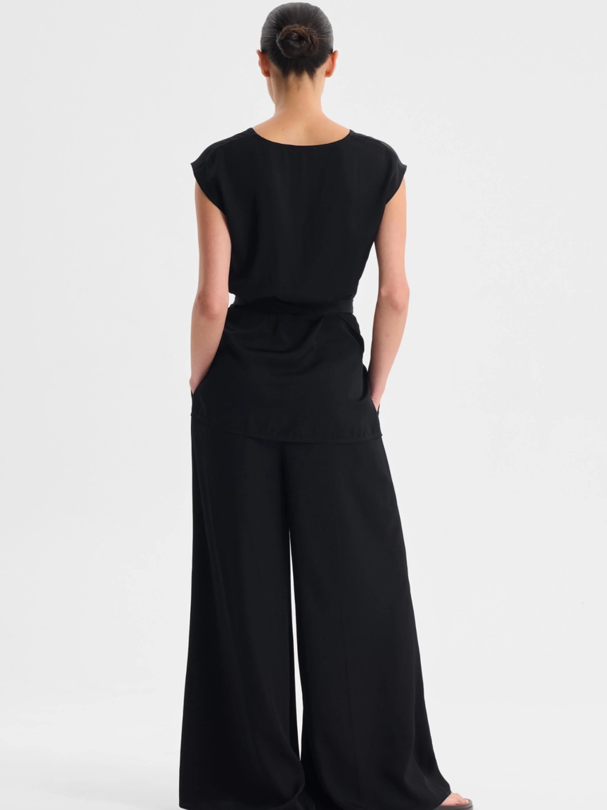 This short-sleeve top is crafted from a softly textured jacquard, offering subtle structure and depth. Thoughtfully detailed with pleats at the neckline and sleeve head, it falls to a clean high–low hem. A back split opening, secured with an invisible zip, allows the wearer to adjust the silhouette for ease or a more sculptural finish - a refined balance of polish and modernity.